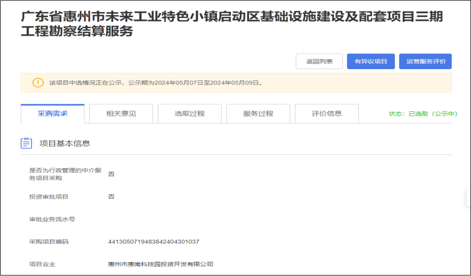 【公示】广东省惠州市未来工业特色小镇启动区基础设施建设及配套项目三期工程勘察结算服务