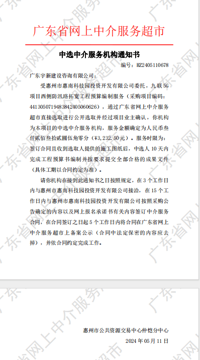 【中选公示】九联5G项目西侧防汛路拓宽工程预算编制服务