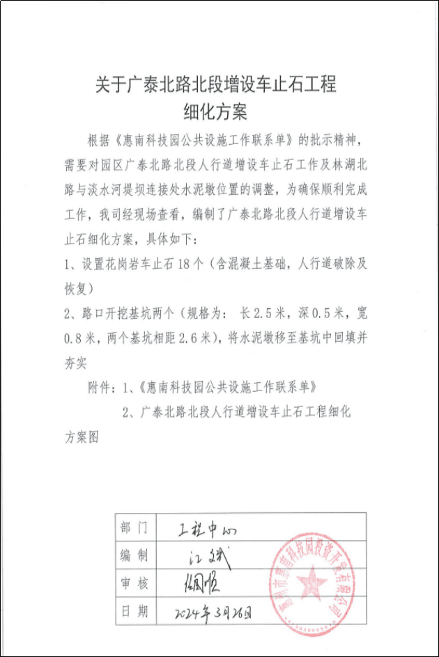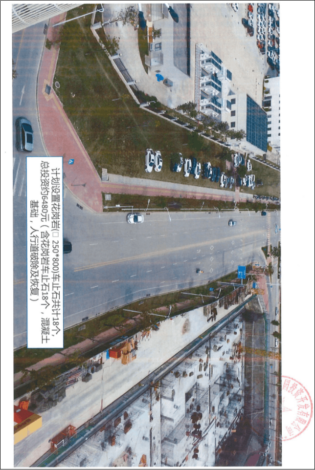 6.招标范围及内容:主要内容包括:1.设置花岗岩车止石18个(含混凝土基础、人行道破除及恢复);2.路况开挖基坑2个(规格:长2.5米,深0.5米,宽0.8米,两个基坑相距2.6米),将水泥墩移至基坑中回填并夯实等。