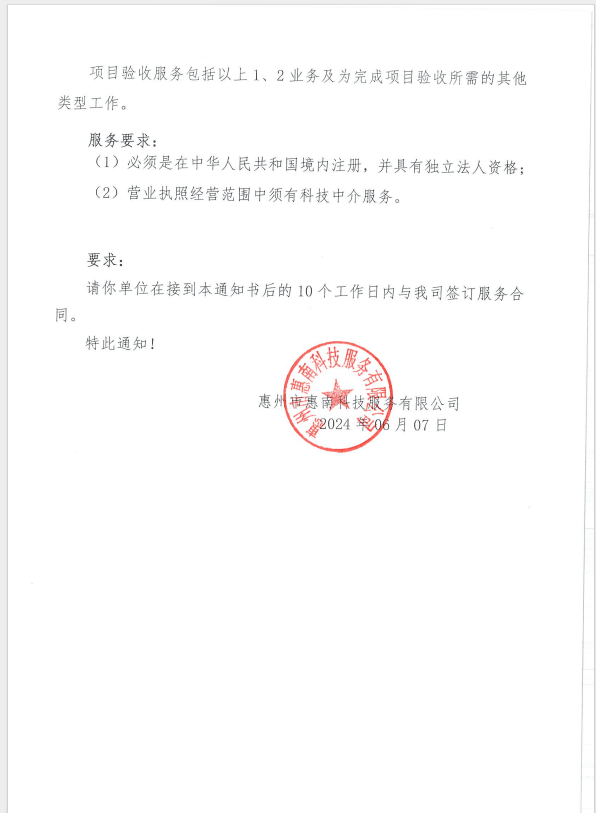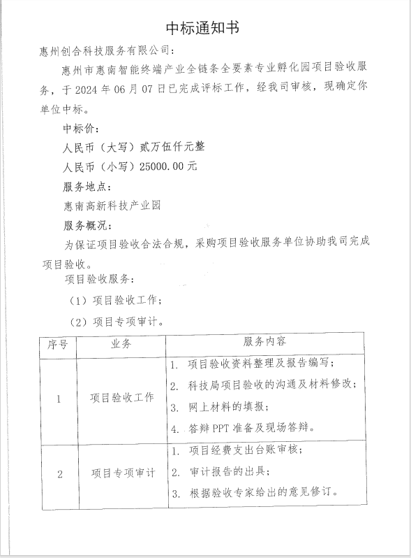 【中标通知】惠州市惠南智能终端产业全链条全要素专业孵化园项目验收服务
