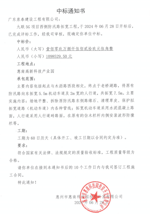 【中标通知】九联5G项目西侧防汛路拓宽工程