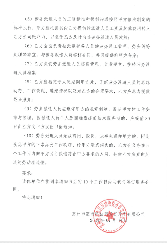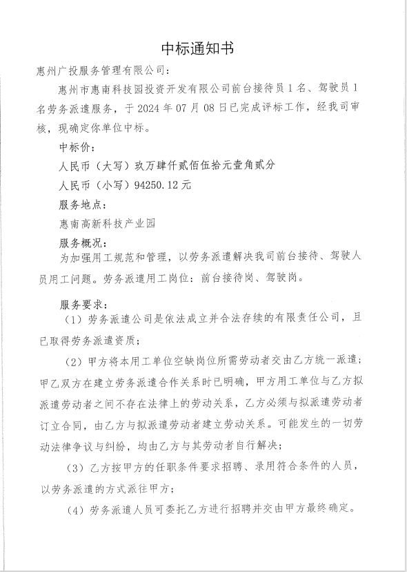 【中标通知】惠州市惠南科技园投资开发有限公司前台接待员1名、驾驶员1 名劳务派遣服务