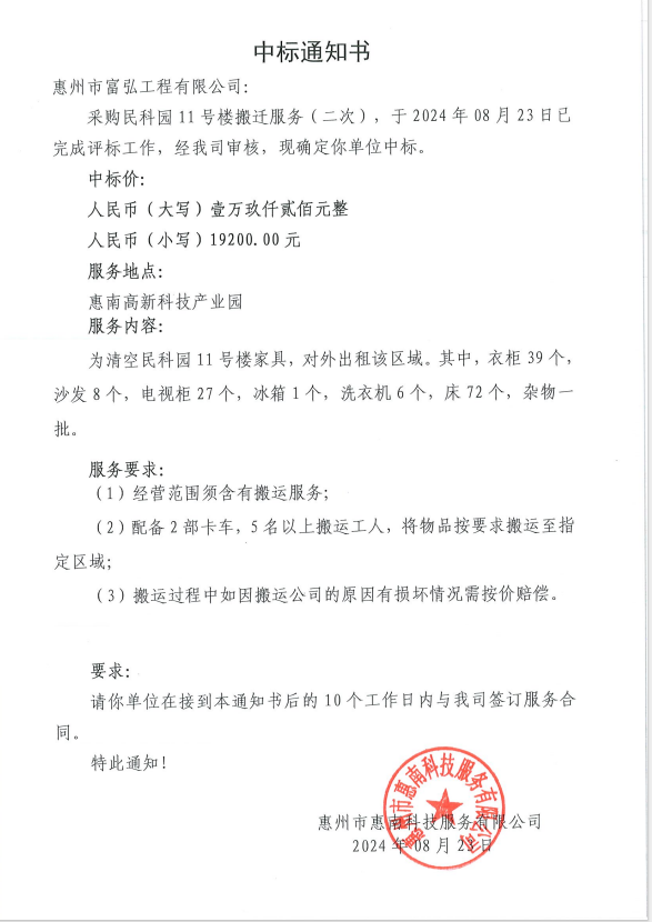 【中标通知】采购民科园11号楼搬运服务(二次)