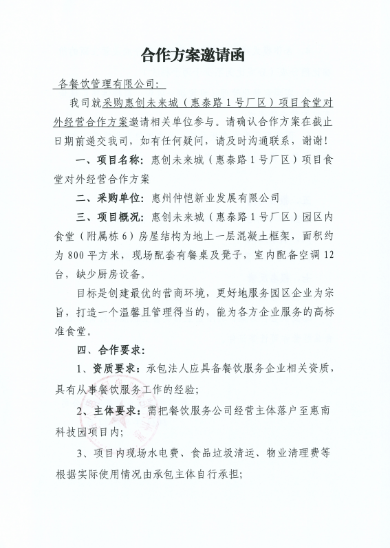 采购惠创未来城(惠泰路1号厂区)项目食堂对外经营合作方案