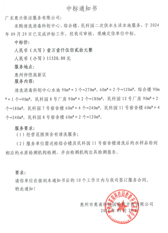 【中标通知】采购清洗消毒科创中心、综合楼、民科园二次供水生活水池服务