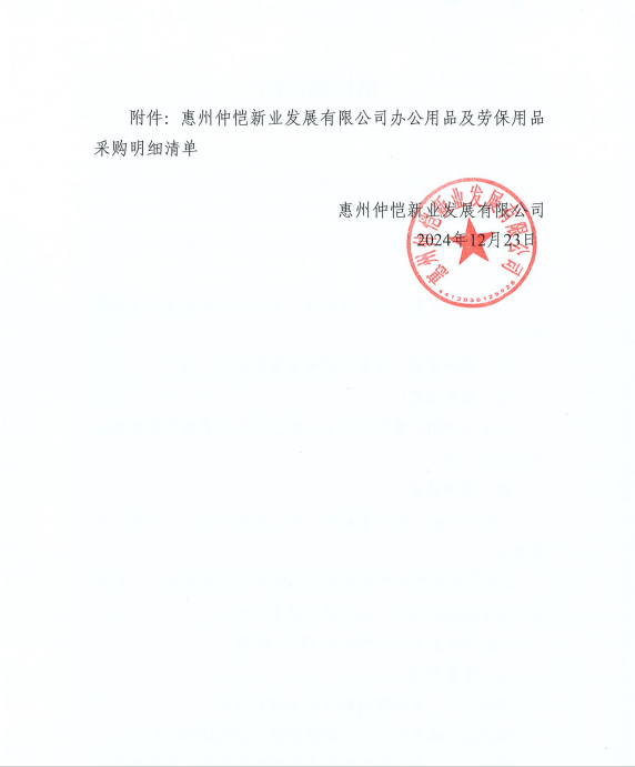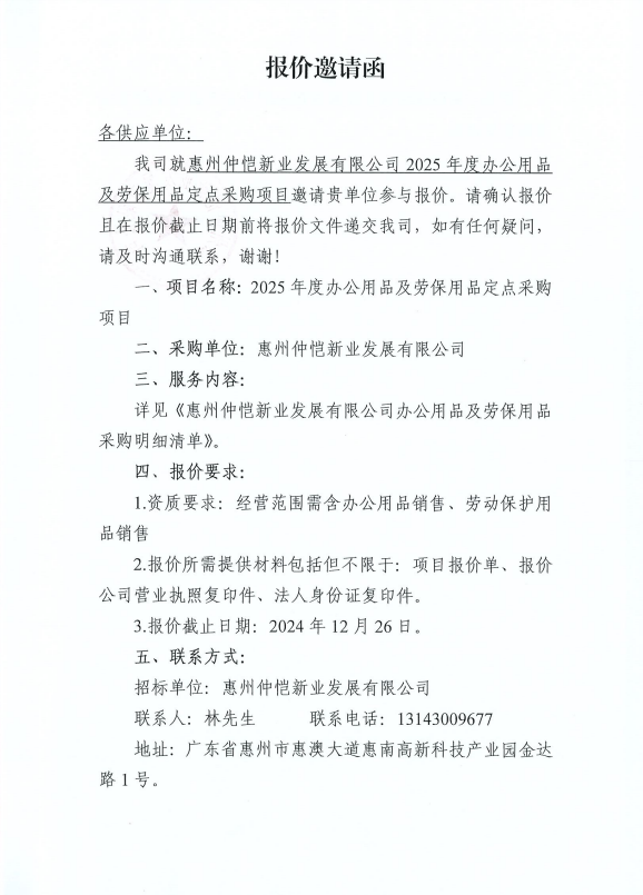 惠州仲恺新业发展有限公司2025年度办公用品及劳保用品定点采购报价邀请函