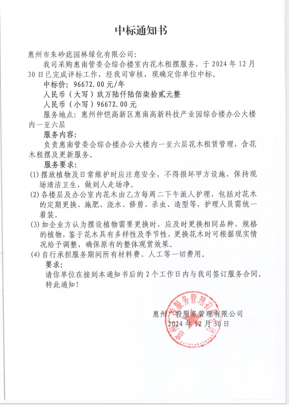 【中标通知】采购惠南管委会综合楼室内花木租摆服务