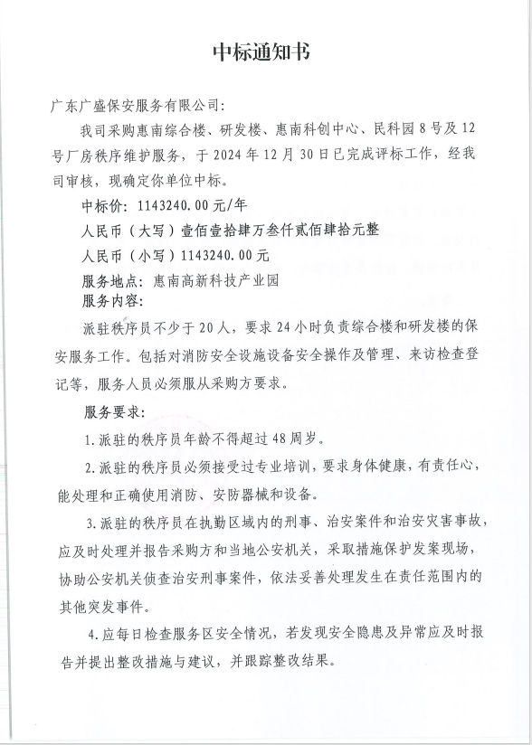 【中标通知】采购惠南综合楼、研发楼、惠南科创中心、民科园8号及12号厂房秩序维护服务