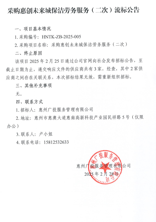 【招标公告】采购惠创未来城保洁劳务服务(二次)流标公告