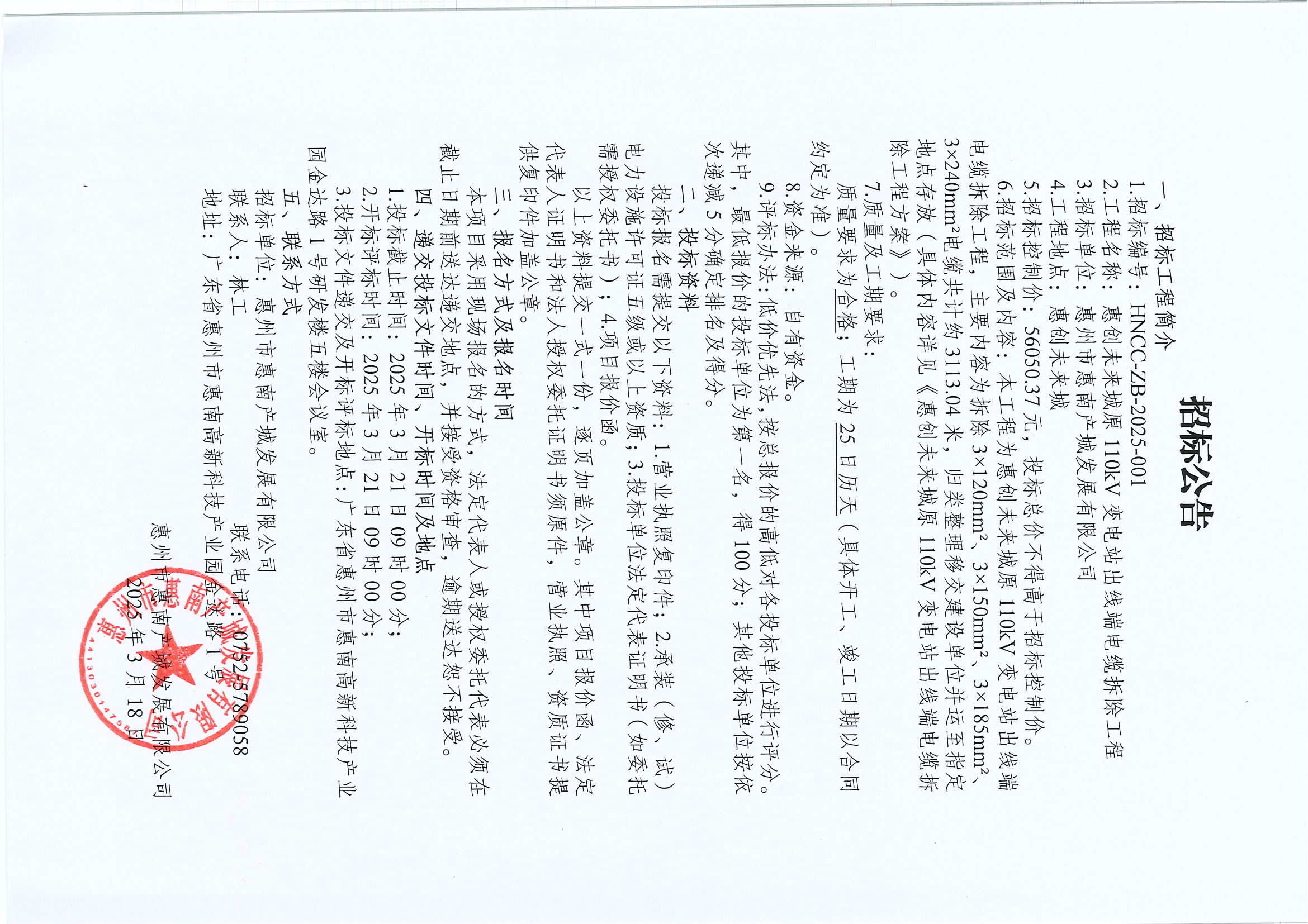 【招标公告】惠创未来城原110kV变电站出线端电缆拆除工程
