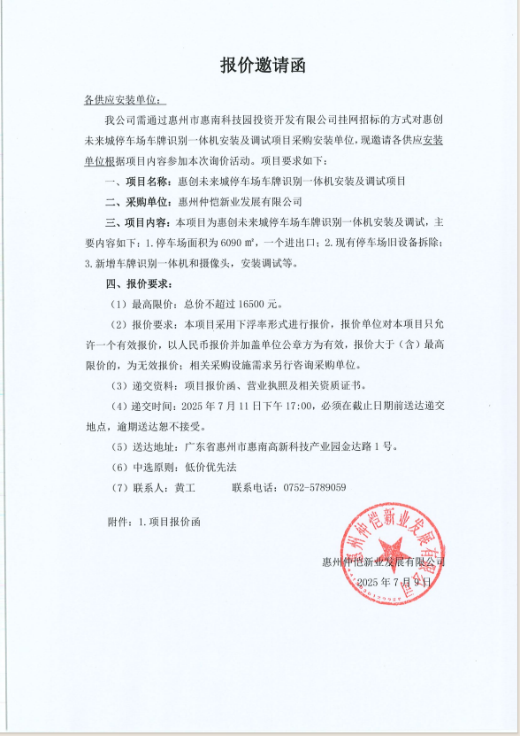 【报价邀请函】惠创未来城停车场车牌识别一体机安装及调试项目采购安装单位