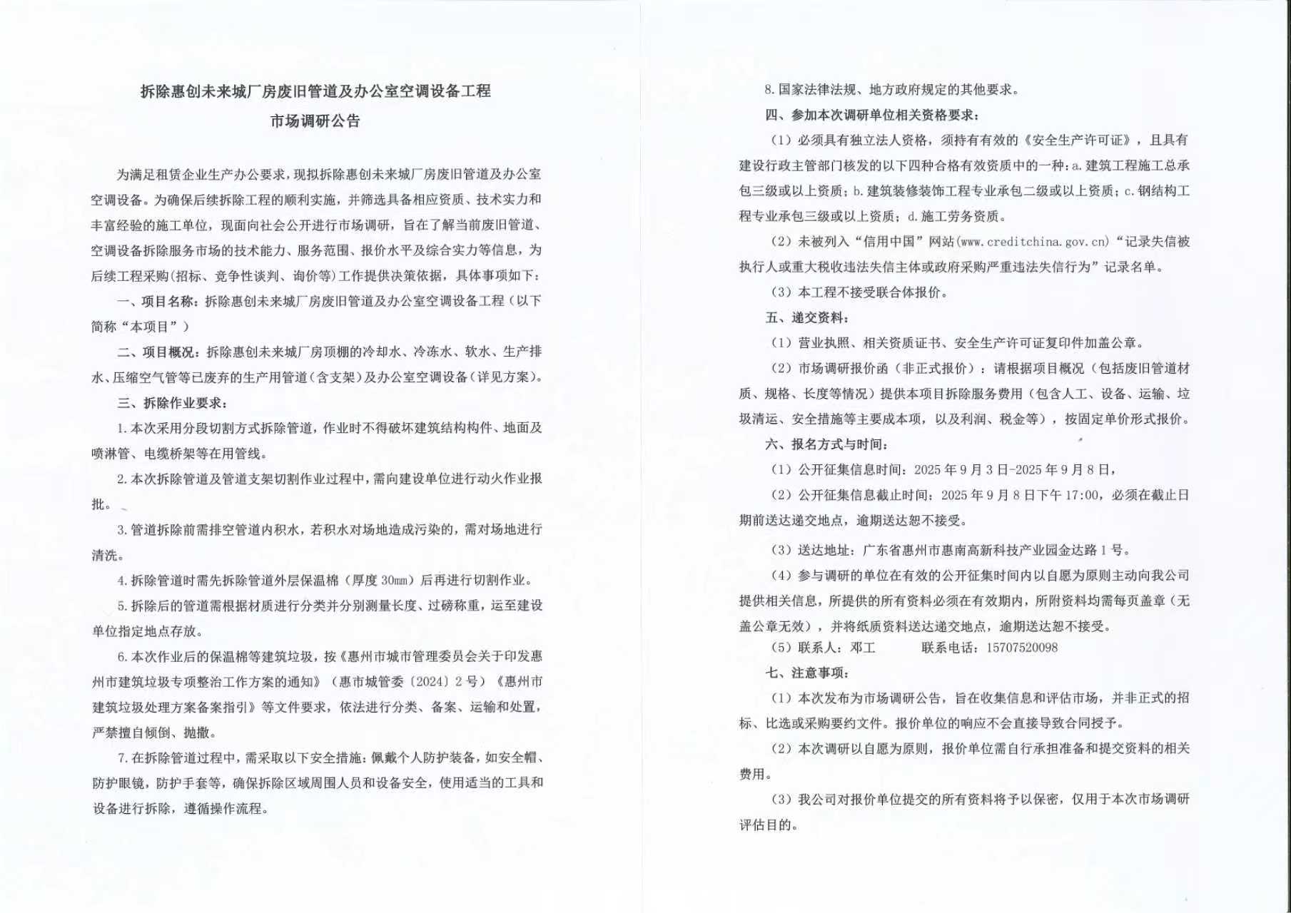 【市场调研公告】拆除惠创未来城厂房废旧管道及办公室空调设备工程市场调研公告