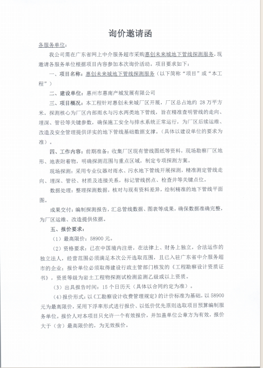 【报价邀请函】惠创未来城厂区水泵房柴油泵及配套设施维修项目