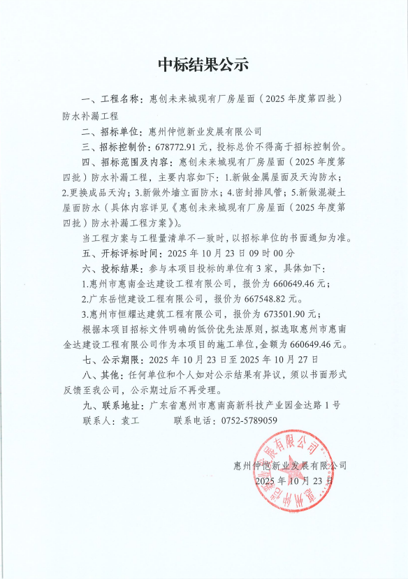 【中标结果公示】惠创未来城现有厂房屋面(2025年度第四批)防水补漏工程
