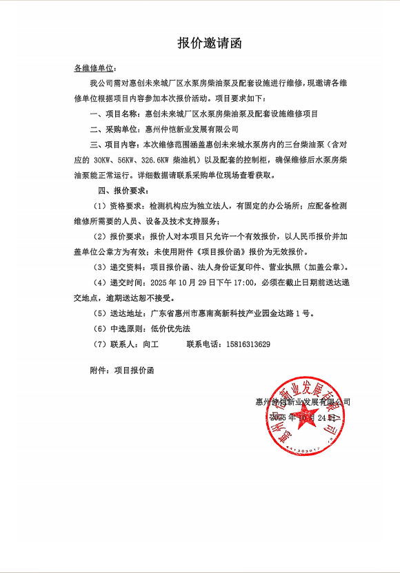 【报价邀请函】惠创未来城厂区水泵房柴油泵及配套设施维修项目