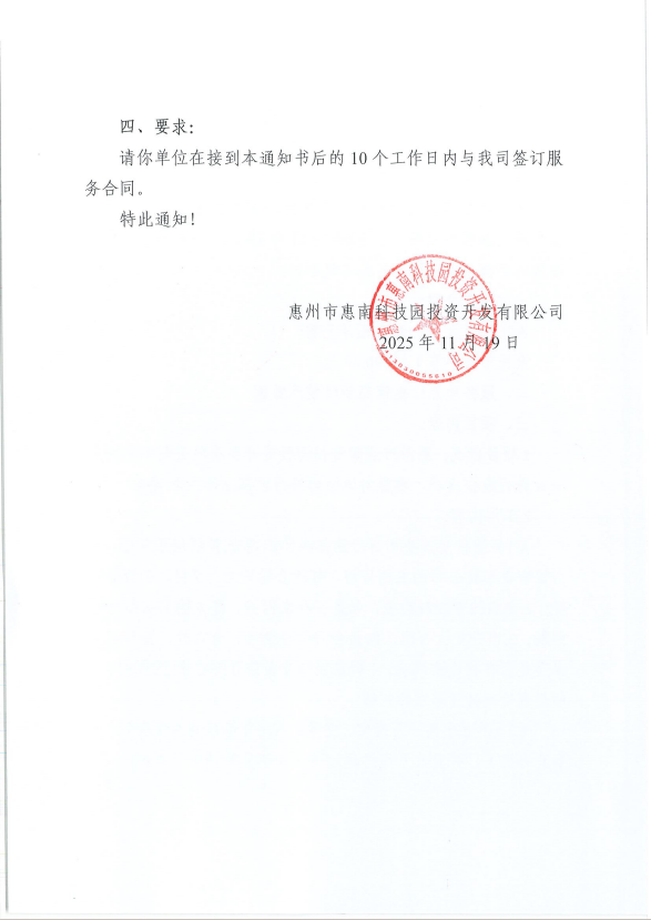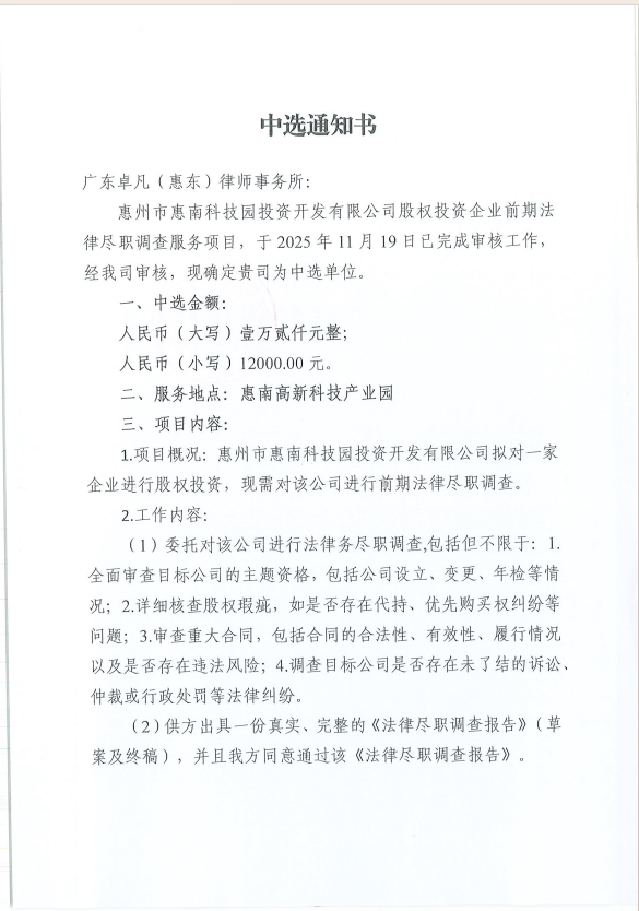【中选通知】惠州市惠南科技园投资开发有限公司股权投资企业前期法律尽职调查服务项目