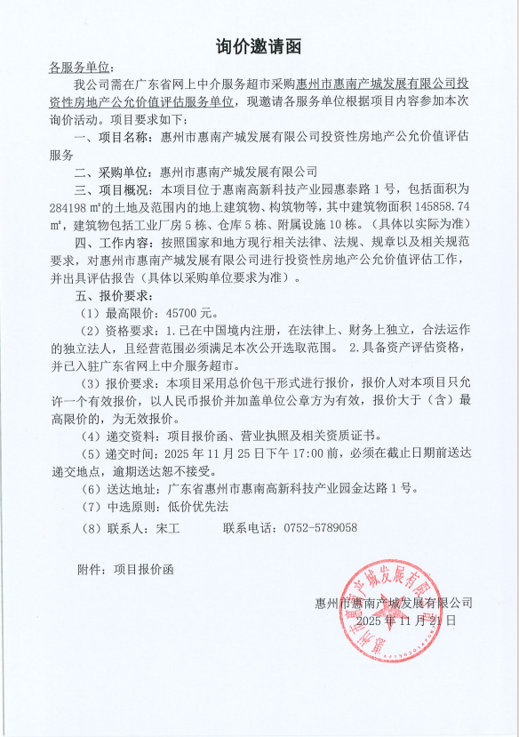 【询价邀请函】惠州市惠南产城发展有限公司投资性房地产公允价值评估服务单位