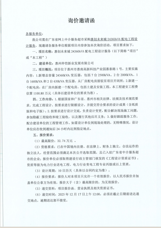 【询价邀请函】采购惠创未来城24360kVA配电工程设计服务