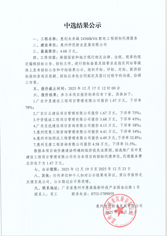 【中选结果公示】惠创未来城 24360kVA配电工程招标代理服务