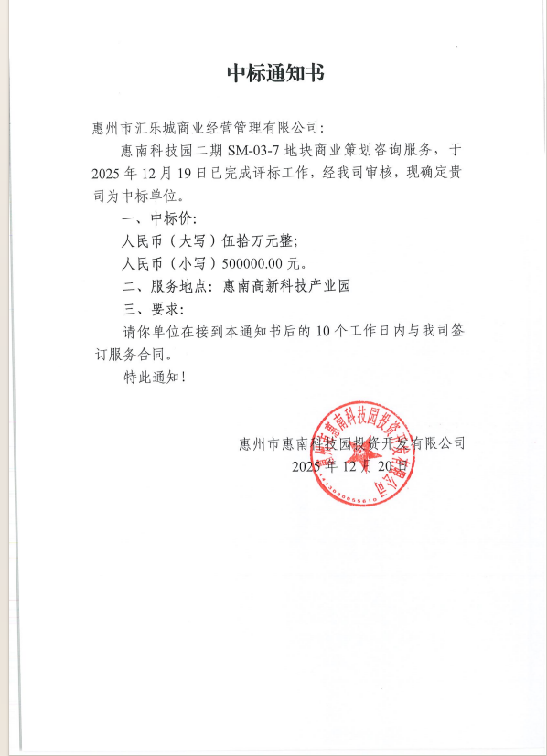 【中标通知】惠南科技园二期SM-03-7地块商业策划咨询服务