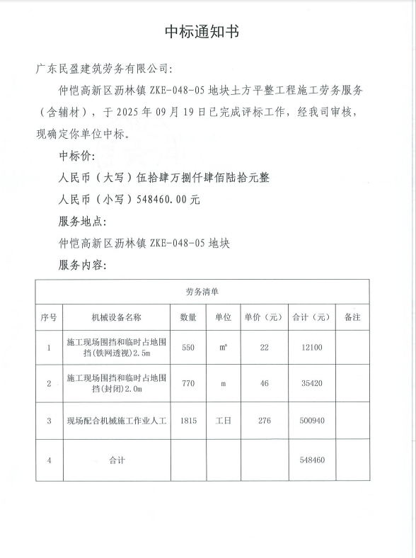 【中标通知】仲恺高新区沥林镇ZKE-048-05地块土方平整工程施工劳务服务(含辅材)