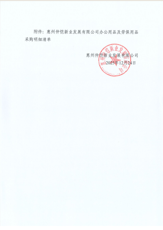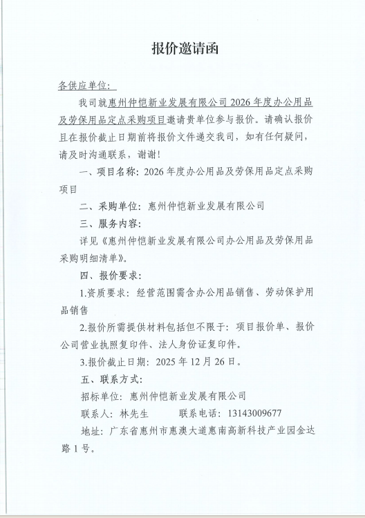 【报价邀请函】惠州仲恺新业发展有限公司2026年度办公用品及劳保用品定点采购项目