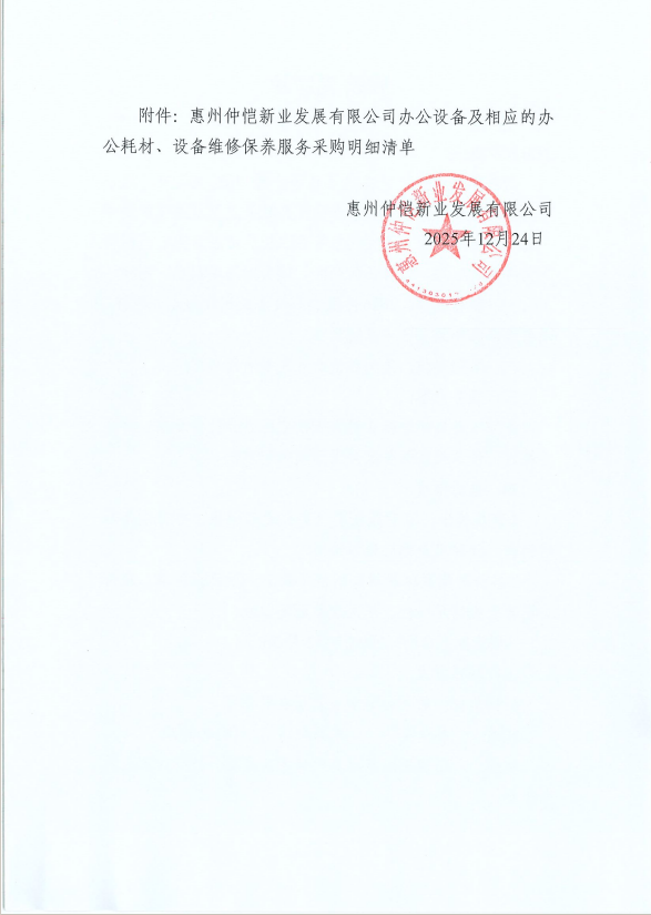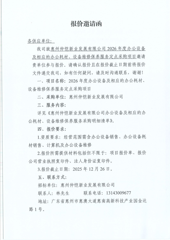 【报价邀请函】惠州仲恺新业发展有限公司2026年度办公设备及相应的办公耗材、设备维修保养服务定点采购项目