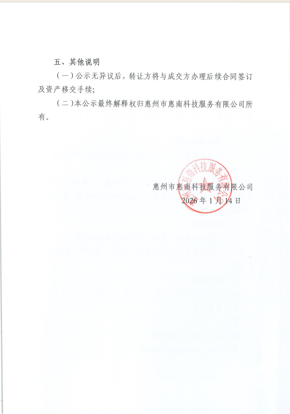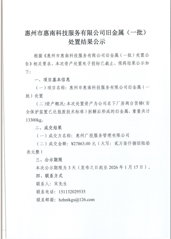 惠州市惠南科技服务有限公司旧金属(一批)处置结果公示