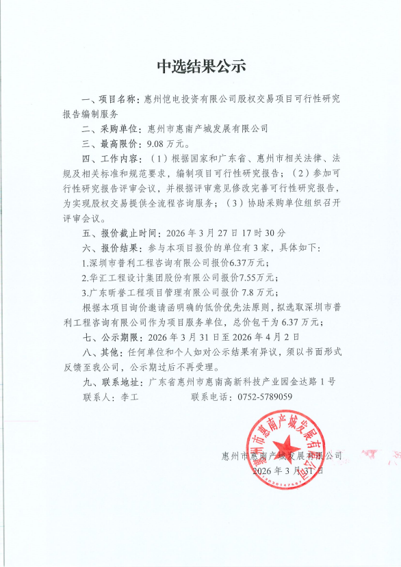 【中选结果公示】惠州恺电投资有限公司股权交易项目可行性研究报告编制服务